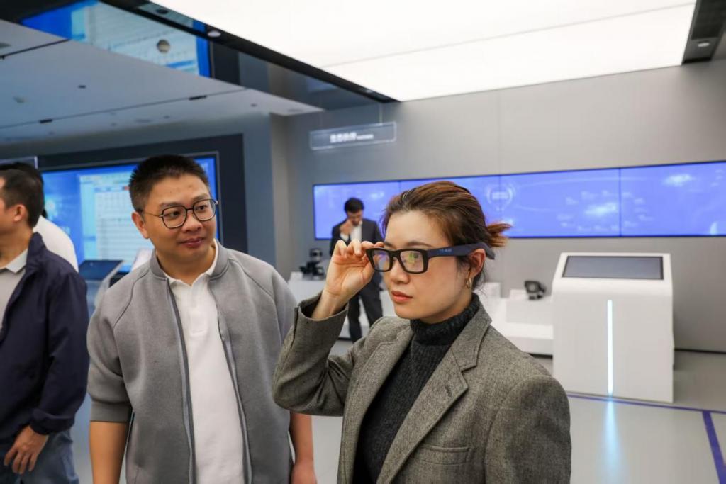 图说:与会人员饶有兴致地体验 AI 眼镜