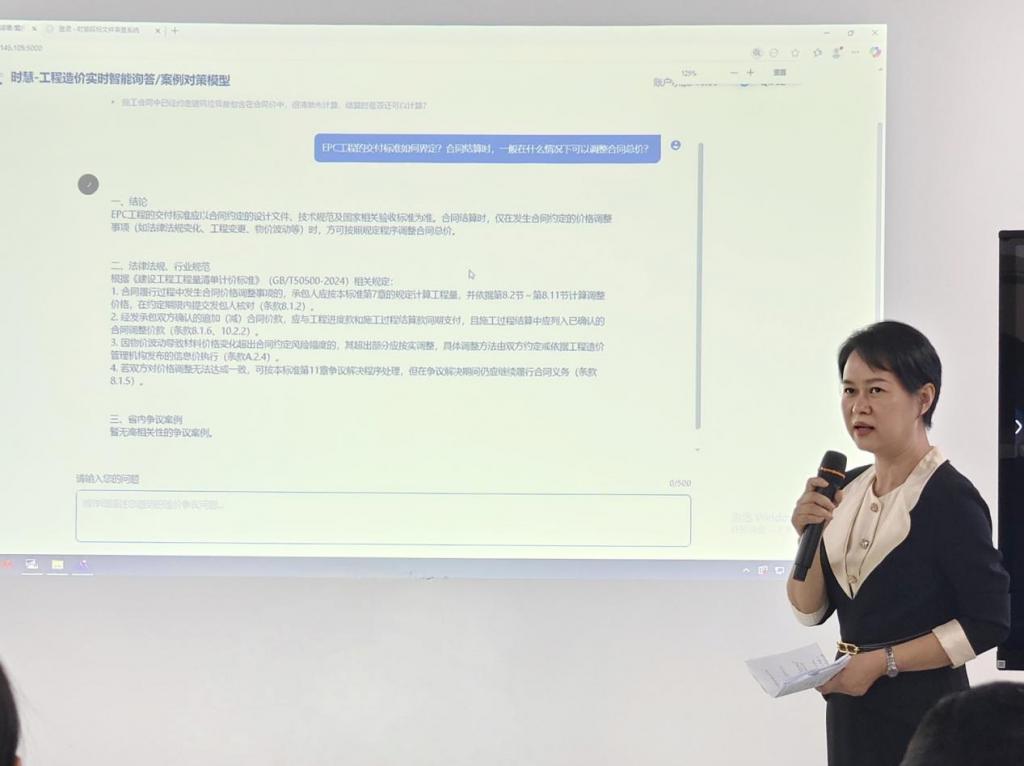 活动交流现场," 时慧 " 工程造价实时智能询答与案例对策模型成为大家交流的焦点,技术人员现场演示了模型在造价争议、上控编制、过程跟踪、结算审核等方面中遇到问题时,向模型直接提问后," 时慧 " 快速给出答复并提供规范依据。该模型多场景的演示,令与会人员眼前一亮,实实在在感受到人工智能技术在咨询领域场景中发挥的实际作用。